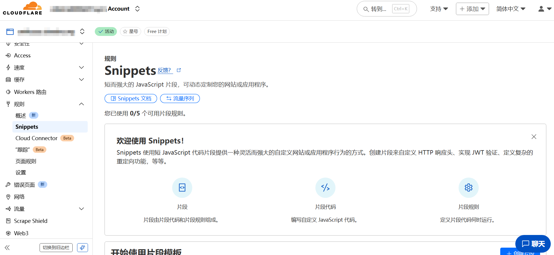 - 如果您看到如下内容,恭喜你!说明当前账号下有域名开启Snippets功能。
