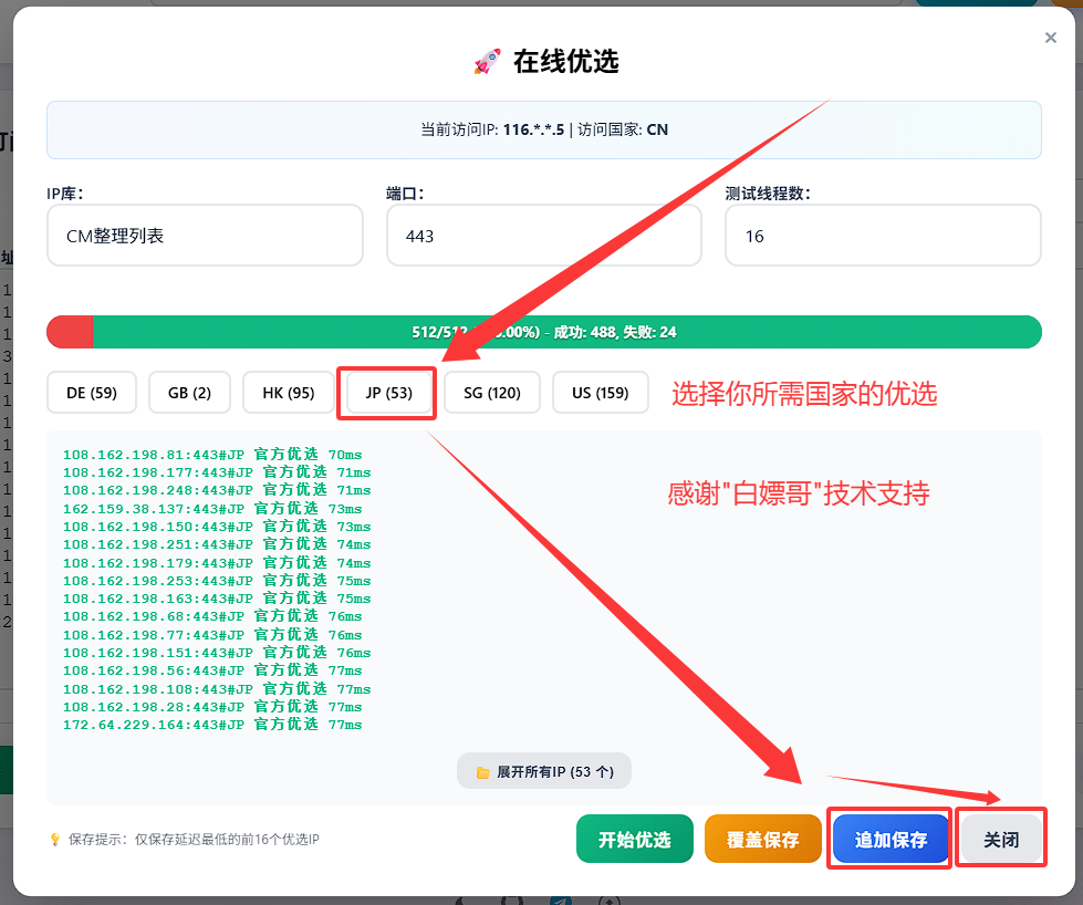 5. 自定义优选 支持 在线优选,自选落地国家,手机浏览器一点就跑,跑完就用!