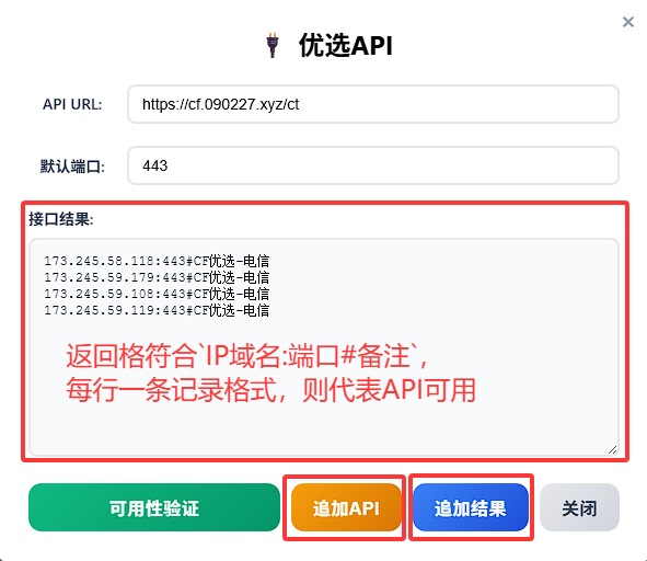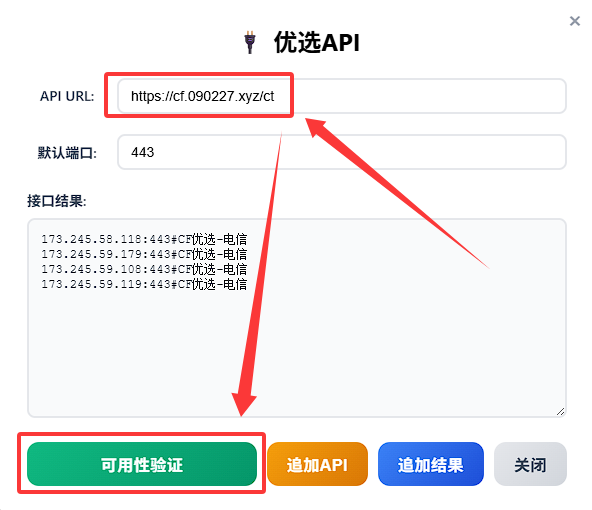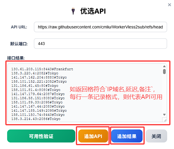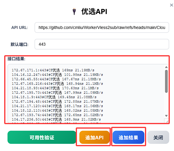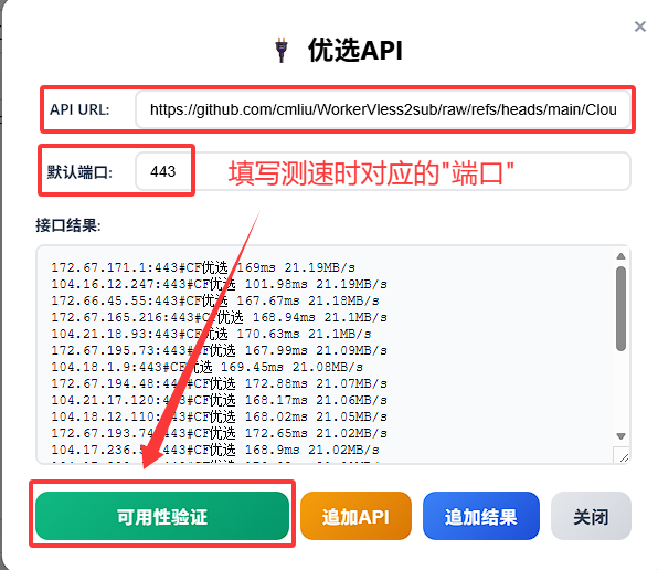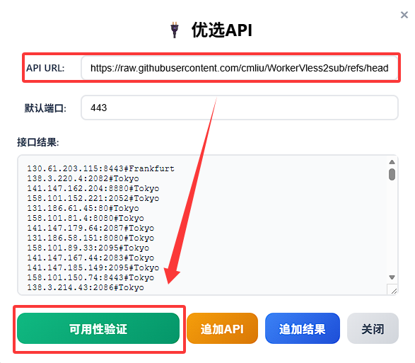 • 例如 https://raw.githubusercontent.com/cmliu/WorkerVless2sub/refs/heads/main/addressescsv.csv,点击可用性验证按钮;